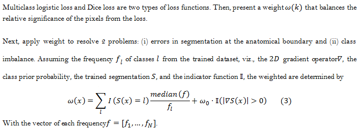 The first term simulates median frequent balancing and compensates for class disparity issues by increasing the weight of rare classes in an image. The next term put high weights on anatomical boundary area for encouraging accurate segmentation of contour.  for providing high priority to boundaries.