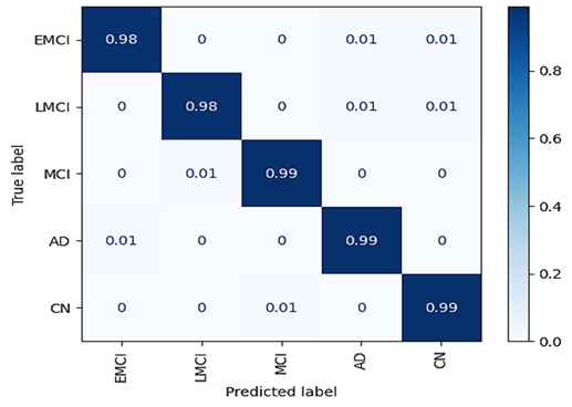Confusion Matrix allows for the evaluation of certain misunderstandings by offering a thorough analysis of the model's projections over several classes. The confusion matrix values provided in Figure 3 indicate the performance of a classification model for Alzheimer's disease, specifically for the five stages: EMCI, LMCI, MCI, AD, and CN. The values presented, such as 'EMCI=0.98', 'LMCI=0.98', 'MCI=0.99', 'AD=0.99', and 'CN=0.99', represent the classification accuracy for each stage. The value 'EMCI=0.98' suggests that the model attained an accuracy of 98% in correctly classifying instances belonging to the EMCI stage. Similarly, 'LMCI=0.98' indicates that the model accomplished an accuracy of 98% in accurately classifying instances belonging to the LMCI stage.