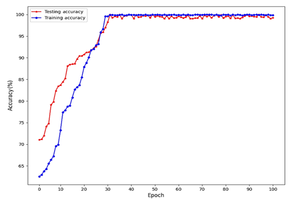 Figure 5 illustrates the categorization of Alzheimer's disease. If the accuracy attained on training data is 100% and on testing data is 99.5%, this suggests that the model has done a very good job of differentiating between the illness's stages. A training accuracy of 100% indicates that the model has learned the training data patterns extremely well. It can perfectly classify the Alzheimer's disease stages in the training set. This high accuracy indicates that the model has captured the intricacies and features specific to each stage during the training process. The testing accuracy of 99.5% suggests that the model's presentation is excellent on unnoticed data, which is a positive outcome. It implies that the model has generalized well and can accurately classify Alzheimer's disease stages in new, unseen instances. The slight decrease in accuracy compared to the training set could be due to the presence of more challenging or diverse examples in the testing set.