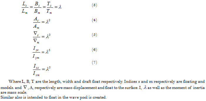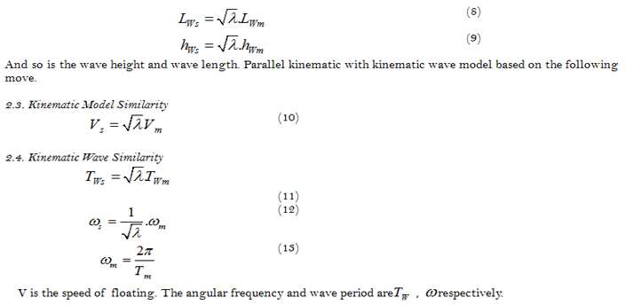 By floating test in wave dynamics model based on similarity parallel kinematic model), the same height and amplitude of incident wave height and wave amplitude pond floating sea (waves geometric similarity), the Froude number Froude number of incident wave sea wave pool to float (parallel kinematic wave), then the dynamic similarity between model behavior in the wave pool and floating in the sea wave is established. In other words, all linear motion is modified to linear motion of the float smaller scale. All angular movements model angular movements of vessels. All the phase difference between the movement and the wave model is floating. All the absolute motion of the ship is similar to the absolute movement of points on the model. All the absolute speeds of the ship are similar to speeds against the absolute points on the model. All the absolute acceleration of the ship to the absolute acceleration points on the model.