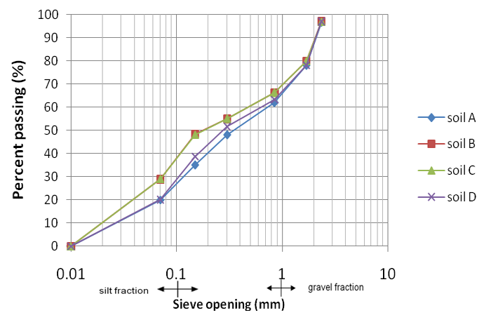 Lateritic soils used for the investigation were collected from four different borrow pit locations around Ile-Ife; sieve analysis of the soils was carried out; the results shown in Figure 1. The cement used was ordinary Portland Cement that conforms to BS 12. The local admixture used was Ipomoea asarifolia (‘Ajara’) obtained from Saki in Oke-Ogun area of Oyo State. It is a climber readily available in the region, broad leafed with the stem acting as storage for fluid and was analyzed in the Department of Biochemistry, Obafemi Awolowo University, Ile-Ife to determine the chemical composition; the result is a in Table 1.