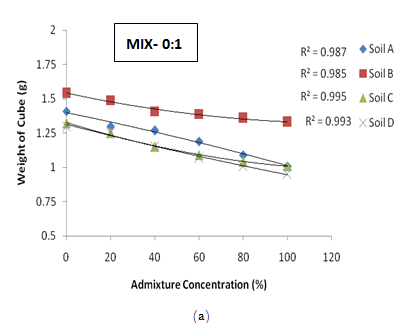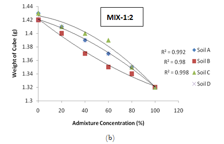 Figure-2. Weight of block as affected by admixture concentration, soil source and mix proportion of mortar material