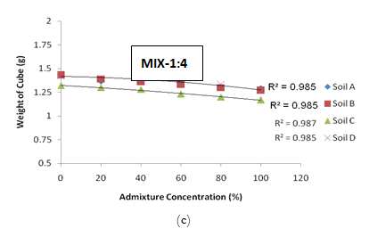 On the other hand, from Table 2 it was observed that mix proportion of landcrete materials has significant effects on the weight of the specimens, (p ˂ 0.01); while considering the Duncan’s multiple range tests, Table 3 it was obvious that the mean difference between 0:1 and 1:2; 0:1 and 1:4; and 1:2 and 1:4 are 0.1560 g; 0.1272 g, and 0.0288 g, respectively. Figure 3a, b and c show the pattern of weight variation in the test specimens as affected by mix proportion.