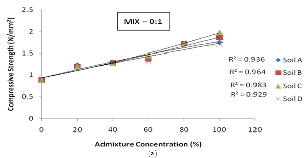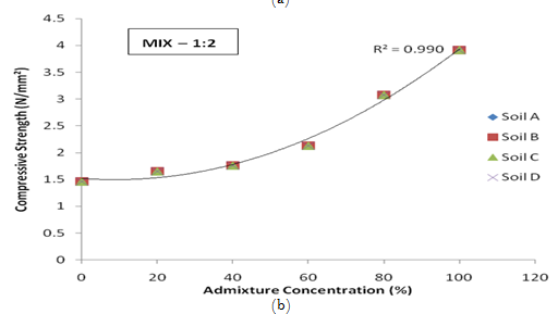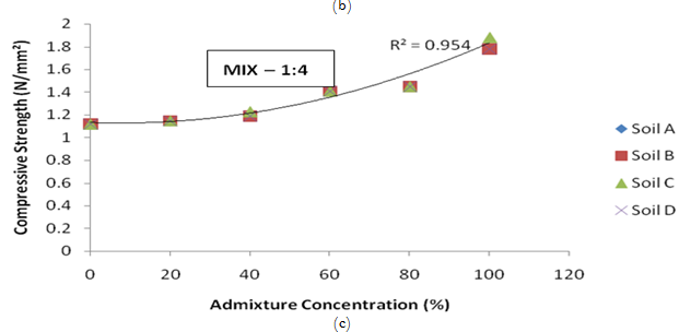 increases, the strength of the cubes increased but with that for Soil C to be highest, followed by those of Soils B, A and D respectively; this pattern was not observed on the stabilized cubes as all soils took same pattern although the strengths increased with increase admixture concentration.