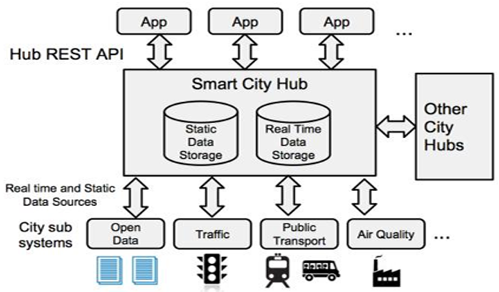 In addition to the deployment of infrastructure as well as management, hubs from cloud based offers a framework to integrate both static and real time urban data sets from private and public parties. The main problem here is the delivery of data and exchange of data, so hubs acts as interface portal for all types of users from primary to end users. Another advantage is easy to use the service provided and available to common man with accessing the nodes easily.