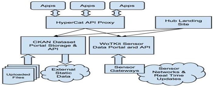 Hub architecture and APIs: The main focus here is to create common catalogue in Creating Smart City Hub with easier data access and sharing IOT resources and data to be diverse set of data and availability. Making a diverse set of data sets and IoT resources available on a hub with a common catalogue is the main focus in the proposed work. Even within the limited scope of the Hyper Cat specification we found that integrating the proposed frameworks systems was difficult. Some of the challenges included, the need to resolve different access control mechanisms, different query semantics, and dealing with large datasets and data catalogues. Based on this experience with Hyper Cat, and how hub data feeds, and the diverse data already available on the web, it may be more practical to agree on how to describe domain-specific data formats rather than agreeing on one format. Using a data format agnostic catalogue like Hyper Cat with a flexible metadata facility for describing both static data sets and IoT resources will allow developers to decide whether they can use data from the resource available.