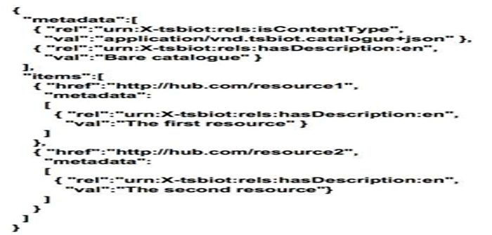 We referred the HyperCat specification as in Hyper [17] developed by the 8 consortia. HyperCat specifies a catalogue and quires on the rules available on the web. Exposed resources are described to provide information about the format and semantics statements as shown in Fig. 5. This enables applications to search for suitable resources and understand the data when they retrieve it. Due to this it is easily describe the resources and easy query on the applications interested by the users. Blackstock and Lea [23].