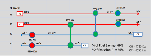 Climate change, global warming and greenhouse effect are direct results of fuel combustion emissions. All industrial countries introduced energy KYOTO protocol through periodical meeting under united nation supervision. The goal of this protocol is obeying and applying emission control regulations. Energy management can save money and in parallel protect the environment by minimizing emissions. Heat exchanger network (HEN) is an important technique for maximizing heat recovery in the industrial chemical process and reducing external heating and cooling utilities [1] . Many searches have been published to improve HENs design and synthesis along the last 40 years [2]. Pinch technology technique is a thermodynamic method used to design (HEN) with the optimal condition to integrate and minimize utilities [3-7]. Mathematical formulation through linear, non-linear and mixed integer linear programming is another method has been applied by several researchers to synthesis the optimum flexible HEN [8-11].