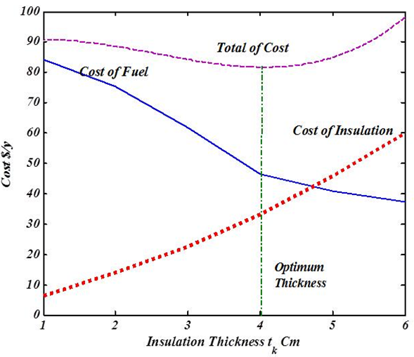 While insulation application reduces heat losses, it required an added capital cost. The insulation thickness (tk) is an effective factor, whereas the thickness increases the surface temperature (Ts) decreases and so on the heat losses (S) decrease. On the other hand, increasing the insulation thickness required more cost see Figure 3. Definition of optimum insulation thickness takes place through the economic balance between fuel cost saving and insulation cost. Where insulation cost can be estimated using Equations 11-15 and cost of fuel loss can be estimated using Equations 16, 17 .