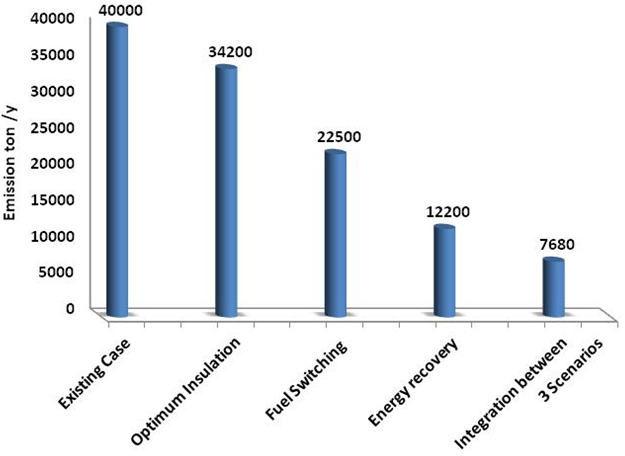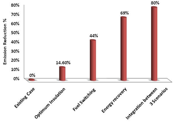 The fourth one is the integration between the 3 techniques; where maximum energy recovery achieved through the revamped unite, using optimum thickness insulation and using natural gas as instead fuel. This integration achieved the highest percentage of emission reduction reach to 80%.