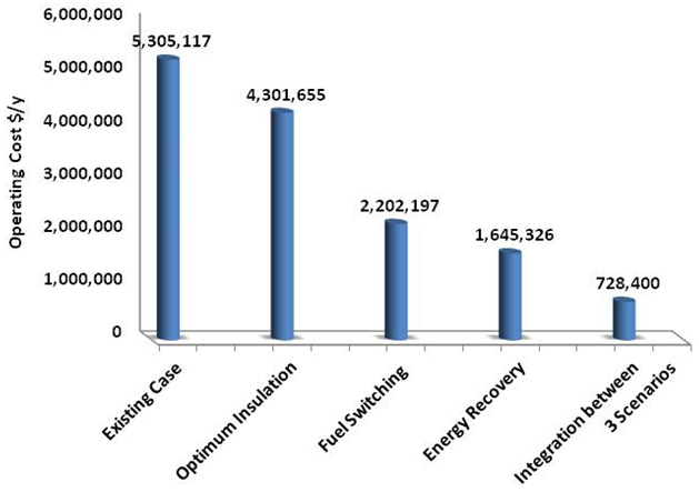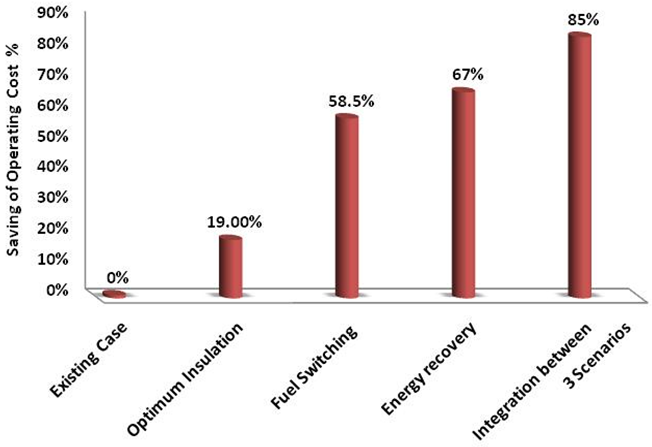 While application the last three techniques separately on the case study achieved good results in control and reduction of CO2 emission, integration between them modified the case study to optimum conditions. The revamped design of the case study by adding two heat exchangers, using the optimum thickness of insulation and replacement of fuel oil with natural gas achieved great results. Comparison between the existing case study and the four techniques results are shown in Figures 8, 9, 10 and 11. The three separate techniques achieved remarkable improvement in both emission reduction and cost saving compared to the existing case. The highest percentage of emission reduction and cost-saving around 80% and 85% respectively can be realized by the integration technique.