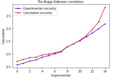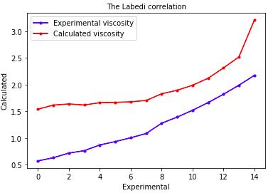 Labedi correlation [3] has been applied to calculate oil viscosities of obtained Azerbaijan oil samples. The comparison of calculated values with predicted values has been shown in figure 2. In this correlation model, AAD is 73.4591%, is 91.4944%, MAE is 70.6893%, RMSE is 73.4825%.