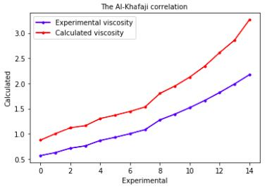 Al-Khafiji correlation [9] has been applied to calculate viscosity of Azerbaijan oil samples. The comparison predicted value with experimental value has been shown in figure 5. AAD is 46.9403%, is 99.6687%, MAE is 55.7998%, and RMSE is 59.5658%.