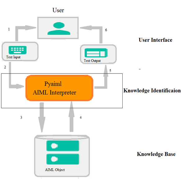 The knowledge of typing based chatbot is shown in Figure 2. When AIML interpreter receives user input, it is converted in AIML pattern and answer is fetched by using backtracking depth-first search algorithm. After matching the pattern, the required answer is return to Pyaiml, which is then displayed to the user. For the next user input, the same process is repeated.