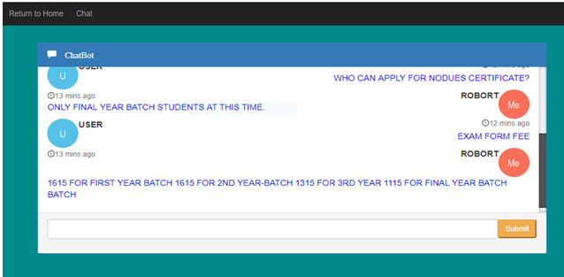 The main page or home page of typing based chatbot provides navigation choices for chatbots in two different languages. First option allows the user to start communication with bot using English language. Figure 3 shows user interface of English typing-based Chabot. In second option, the user can communicate with bot using Urdu language. Figure 4 shows user interface of typing based Urdu chatbot. The chatbot user interface is a text box where user can write their quires. After receiving the queries, the chatbot sends this input to the system and after receiving the response, it is displayed on the screens.