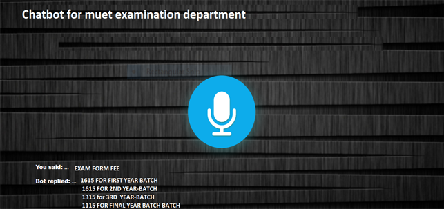 This chatbot can answer only MUET Examination department’s related queries, in future the chatbot will be able to response over all administration side related queries. In present chatbot the voice based chatbot support only English language in future Urdu voice based chatbot can be developed.