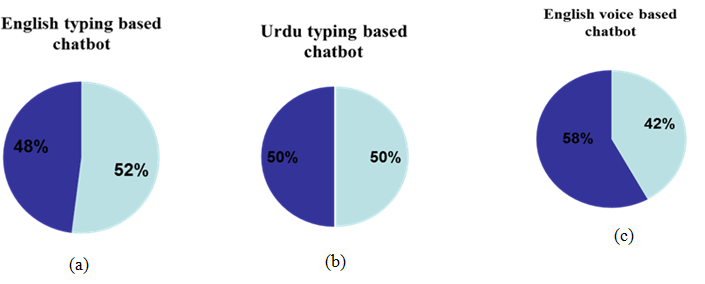 The evaluation was carried out in order to compare and find the best interface among the three chatbot interfaces. During the evaluation process, 50 students from MUET Jamshoro were asked to test all the three flavors of chatbots by asking three questions. Among the participants who took part in evaluation, 29 were male and 21 were female with ages between 19 and 22. A survey was presented to find the best interface by general understanding of the students regarding chatbot usability and easiness. The survey questions and the participant’s responses are given in Table 1. The results and student’s feedback regarding the use of three interfaces of chatbot system were calculated and presented in graphs.