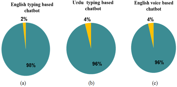 Figure 8 a, b, c is showing the combined comparative analysis of question 1, 2, 3. During testing of English typing based chatbot, out of 50 students, 52% of students replied with “strongly agree” with using this interface of chatbot and remaining 48% replied with “agree”. None of the student has found it difficult while using that English typing based chatbot. In testing Urdu typing based chatbot, 25 students among total of 50 students responded with “strongly agree” with using this Urdu typing based interface of chatbot, while the remaining 25 students replied with “agree”. None of the student has found it difficult while using that interface. In testing English voice based chatbot, among all students, 21 students (42%) responded “strongly agree” to use voice based chatbot and 26 students (58%) responded with “agree” to use this voice based chatbot. After comparative analysis of results, all interfaces were found easy to use and among three English typing based chatbot is found best.