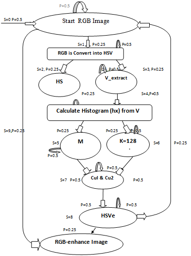 The labeled transition diagram of the HFIE Algorithm shown in (Figure 1) which is created by following all the steps of HFIE Algorithm. It is consisting of ten states which are labeled from s=0 to s=9. In Figure 1, P shows the probability of transition from one state to next state. For example, there is fifty percent probability that RGB image is moved from s=0 to s=1.