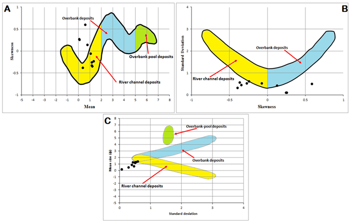 A: Skewness vs. mean grain diameter; B: Standard deviation vs. skewness; C: Mean grain diameter vs. standard deviation.