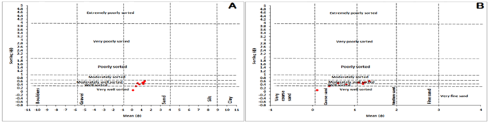 Figure-11. Bivariate plots: (A) Mean size vs. Skewness; (B) Sorting vs. Skewness, fields based on Blott and Kenneth [72]. (This study).