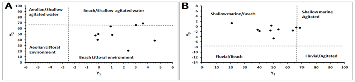 Figure-12. Cross plots of the linear discriminant functions of the sediments: (A) Y1-Y2 and (B) Y2-Y3. (This study).