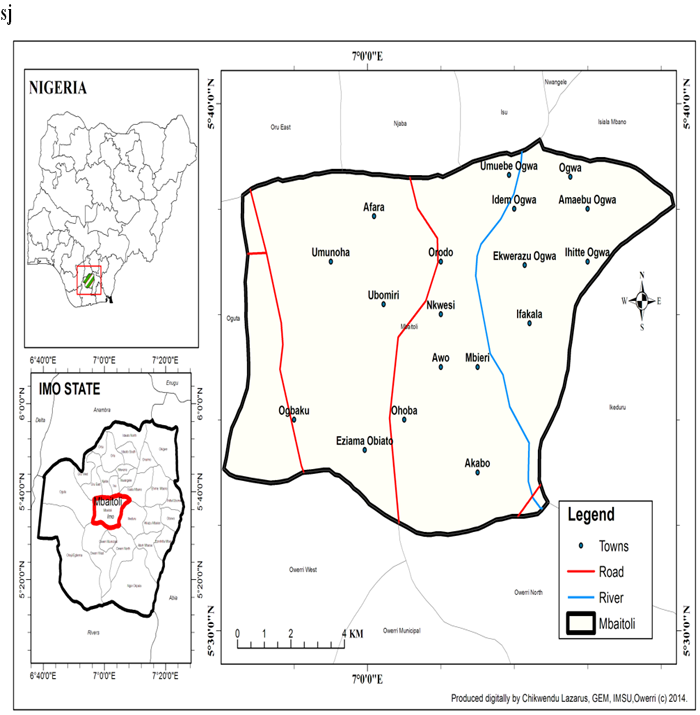 Location/Extent: Mbieri is one of the communities that make up Mbaitoli Local Government Area (LGA) in Imo State. The Local Government Area is bounded on the north by Nkwerre and Isu LGAs, on the south by Owerri Municipal and Owerri North LGAs, on the east by Ikeduru LGA and on the west by Ohaji Egbema, Oguta and Oru East and Oru West LGAs. Fig. 4 is map of Imo State showing Mbaitoli LGA and Fig. 3 shows the communities in Mbaitoli LGA.