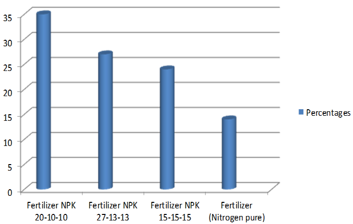 Different kind of NPK fertilizers in the varying ratio of the contents of the Nitrogen-Phosphorus-Potassium (NPK) are used in the study area. From the bar graph below, 35% of the respondents make use of Fertilizer NPK 20-10-10, 27% make use of Fertilizer NPK 27-13-13, 24% uses fertilizer NPK 15-15-15 while the remaining 14% uses fertilizer (Nitrogen pure). Farmers make use of Fertilizer with high Nitrogen because it enhances the health of the plant by making the leaves of the plant to be very green, those who prefer a healthy and improved stem, tubers and fruiting goes for the one with high proportion of Phosphorus and Potassium respectively.