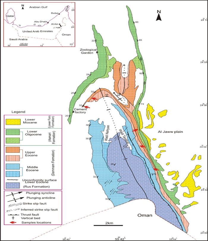The geology of the study area is relatively well-known and documented in terms of lithology, structural features and major stress-strain fields. The Hafit Mountain is a double plunging, highly asymmetric anticline that is developed over two large thrust faults underlying on its eastern and western limbs. It is classified into three main rock units that are composed of different types of carbonate rocks (limestones) (Fig. 1). The oldest rock unit is the Rus Formation (Early Eocene 55-49 Myr) followed by Dammam Formation (Middle to Late Eocene 49-34 Myr) and then overlain by the third rock unit, which is the Asmari Formation (Early Oligocene 34-29 Myr) [5, 8, 10].