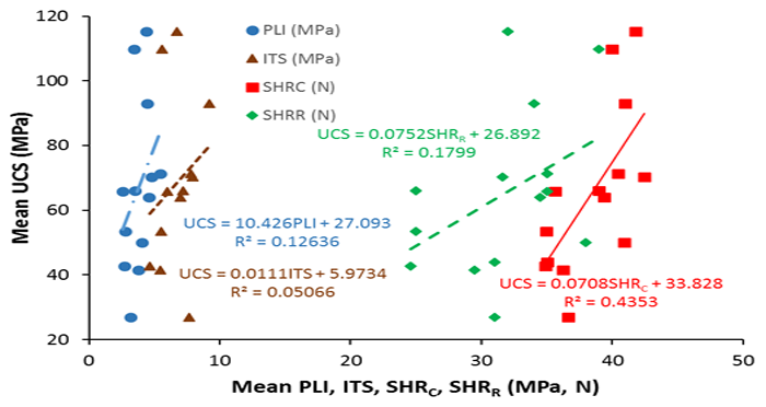 The respective relations between the mean PLI for 50 mm in diameter size rock sample, ITS, SHRc, SHRR and the mean UCS, are shown in Fig. 2. Data points are highly scattered. The R2 values in Fig. 2 are indicative of weak to weaker relationships.