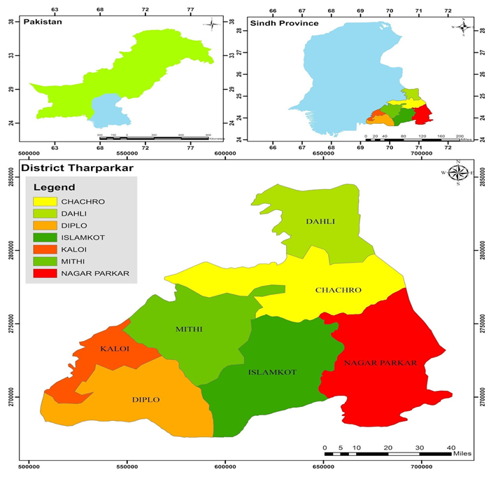 The region chosen for the study is the District of Tharparkar from Sindh Pakistan. Tharparkar is situated between the longitudes and latitudes of 69° 3′ 35′′ E and 71° 7′ 47′′ E, 24° 9′ 35′′ N and 25° 43′ 6′′ N. According to the 2017 census, the population of Tharparkar is 165,966,1. Except for a few agricultural areas, Tharparkar is largely desert. In the past, it has been the apex of several droughts, which is the main reason behind the choice of this area of research. In the Tharparkar district, there are 7 talukas, namely Chachro, Dali, Diplo, Islamkot, Kaloi, Mithi and Nagarparkar. Figure 1 shows the map of the study area. Figure 1 is created using GIS for the purpose of this research.