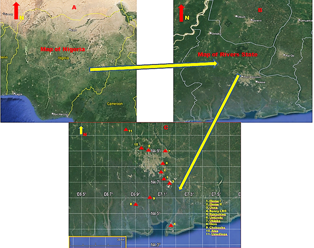 Figure 1. A) Map of Nigeria [25]; B) map of rivers state [25]; C) the locations of 11 flaring sites examined in Rivers State, Nigeria.