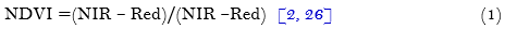 NDVI was retrieved from the atmospherically corrected Red (R) and Near Infra-Red (NIR) reflectance (Figure 2). The quantification of photosynthetic activity is carried out using Normalized Differential Vegetation Index (NDVI) algorithm. NDVI is vigorously corresponding to vegetation density and liveliness [2, 26]. NDVI is established on a high reflectance in the NIR by plant matter in contrast to the strong absorption by chlorophyll‐a in the Red wavelengths. For Landsat 7, band 3 is Red and band 4 is NIR. For Landsat 8, band 4 is Red and band 5 is NIR.