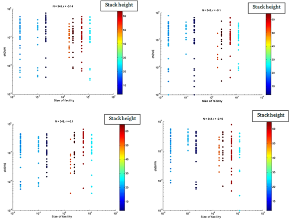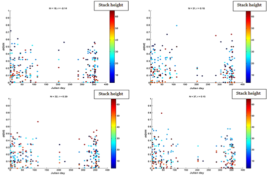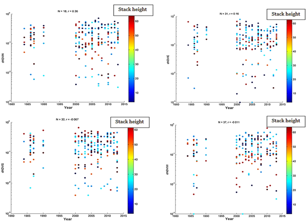 Multiple linear regression was applied to the relationships between each of the (NDVI450-60)mN, (NDVI450-60)mE, (NDVI450-60)mS and (NDVI450-60)mW and the facility size, stack height, and time). Table 6 shows the results (r2 and p-values).