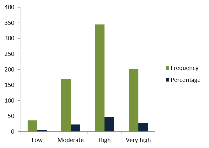 One of the recent terrifying menace endangering human existence, driven from gas flaring is the potentiality of a rapid warming of the planet earth impelled by the agglomeration of heat retaining gases on the atmosphere which has led to a phenomenon in recent time called green house effects. This phenomenon has contributed in altering the climatic condition of the atmosphere which in turn has impact negatively on vegetations and farmlands (Ndinwa and Akpafun, 2012). Typical flare sites in the oil fields are located at ground level and surrounded by thick vegetation, farmlands and huts which are 15-35 metres away from the flare (Ilori, 1999; Oghenejobh, 2005). The radiation from the exothermic combustion process is a function of the flame temperature and the geometrical design of the flare stack. In some cases the surrounding soil is scorched, vegetation and farmlands are parched and villagers often complain of internal heat due to the cumulative effects of long exposure to radiant heat (Ilori, 1999; Oghenejobh, 2005). Indicated in Figure 14 above, is respondents’ perceived impact of gas flaring on household food insecurity. It was revealed that 207(27.6%) of the respondents disagreed that gas flaring could cause farm household food insecurity in the communities. Also, another 81(10.8%) of the sampled respondents were of strong disagreement with the questionnaire whereas 318(42.4%) of them attested that gas flaring could cause food insecurity to farm households. More so, 144(19.2%) of the respondents strongly agreed to gas flaring been a cause of food insecurity in their various communities. This finding corroborated and maintained the findings in the reports by Ogunfiditimi (2005); Ajugwo (2013); Oseh et al. (2015).