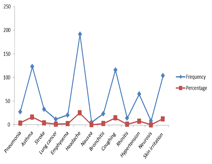 Health diseases such as asthma, bronchitis, cancer and skin diseases among patients residing close to flaring site have been reported to directly correlate to gas flaring by Ogunfiditimi (2005). Studies from other parts of the world have as well linked health issues such as skin disorder, heat irritation, sunstroke and heat exhaustion to gas flaring (Luginaah et al., 2002; Cutchin et al., 2008). Information displayed in Figure 11 concerning respondents’ opinion on the kind of health disease, them or any member of their family have suffered resulting from flaring of gas in the communities revealed that 27(3.6%) of the respondents affirmed that either themselves or family member have suffered pneumonia, 123(16.4%) of the respondents claimed to have suffered asthma, 33(4.4%) of the sampled respondents affirmed to have suffered stroke, 12(1.6%) attested that their family member have suffered lung cancer resulting from exposure to gas flaring sites, 21(2.8%) of the respondents claimed that members of their family has suffered emphysema, 192(25.6%) attested that their family members have been a victim of headache, 6(0.8%) confirmed to be victim of nausea, 24(3.2%) acclaimed that their family members have suffered bronchitis, 117(15.6%) of the respondents opted for cough as the illness suffered by their family members, 15(2%) attested that there have been reported cases of rhinitis among their family members, 66(8.8%) of the respondents identified hypertension as the illness their family members have suffered, 9(1.2) of the sample households claimed neurosis as the illness reportedly suffered by their family members resulting from the exposure to gas flaring in the communities whereas 105(14%) confirmed that there has been reported cases of skin irritation among family members. This implies that none of the sampled household respondents opted out from any of the health diseases; they all affirmed to have either suffered or have family member who have suffered from one health disease or the other. This finding affirms the reported finding of Akuirene et al. (2019) that there is a potential linear relationship between acid rain from gas faring communities with diabetes and cardiorespiratory diseases. It also corroborated the report by Opafunso (2005) who established 87% and 78% of observed health related environmental impact of gas flaring in Delta and Rivers States respectively. The official report of FOE (Friends of the Earth) (2004) indicated that gases flared into the environment of the oil producing communities in Nigeria contain widely-recognized toxins which pollute the air and induces serious respiratory ailment such as asthma, inflammation and bronchitis.