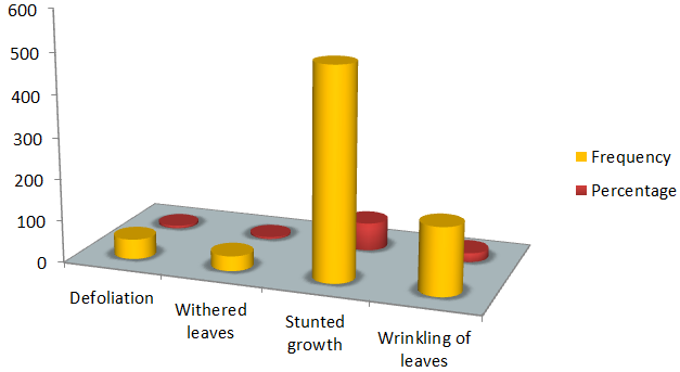 Globally, flaring of gas is a major environmental concern due to its high emissions of methane, CO2 and benzene, which are known ozone-depleting substances and contribute to global climate change phenomenon (World Bank, 2008). Respondents’ opinion concerning how they perceive the level of temperature experienced in their localities in terms of heat wave revealed that 36(4.8%) of the respondents consented that heat wave generated from the flare sites are low; 168(22.4%) of the sampled respondents claimed that the temperature is moderate. However, 345(46%) of the respondents attested that heat wave experienced in their various communities are high whereas another 201(26.8%) consented that they experience very high heat wave in their communities as a result of the flaring sites. This finding corresponded with the study by Bassey (2008); Orimoogunje et al. (2010) and Ajugwo (2013) whom in their different studies affirmed that gas flaring raised the temperature of the study area and rendered large area of land inhabitable and uncultivable by farm households. It further confirmed the submission by Efe (2003) that due to increased temperature in gas flaring communities, climate variability, proliferation of pests and widespread disease have seriously affected the quality of lives and well-being of farm household. Reports from several scholars have established that heat radiation from gas flaring site contributes to the increment in the soil temperature, which in turn destroy plants since plants absorb CO2 from the atmosphere (Tolulope, 2004; Opafunso, 2005; Tzimas et al., 2007).