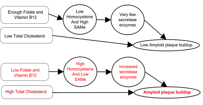 Beta-secretase and gamma-secretase are two enzymes expressed in brain neurons that can abnormally cleave amyloid precursor protein (APP) into amyloid peptides [3]. These amyloid peptides can be toxic and can contribute to the formation of amyloid plaques, a signature feature of Alzheimer’s disease. If we can reduce beta- and gamma-secretase biosynthesis, then there may be less abnormal cleavage of the APP [4]. Less abnormal cleavage of the APP can lead to less amyloid plaque buildup from amyloid peptides. There are no drugs available to slow the formation of the secretase enzymes. Pharmaceutical attempts to slow the production of gamma- and beta-secretase enzymes have not been successful. However, there is evidence that expression of these two enzymes can be decreased by supplying folate and cobalamin to assist the transformation of homocysteine into s-adenosylmethionine (SAM). SAM has the ability to quench, through methylation, the production of beta- and gamma-secretase.