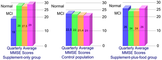 Average MMSE scores in the supplement-only group at baseline were 19—just slightly lower than the lower limit for MCI, which is 20-25. This may have indicated a slight drop in cognition since diagnosis of MCI and prior to the study commencement. At the end of nine months the average score was 29, indicating a normal cognitive state. This was an increase in 10 points out of 30. The MMSE score did not change much in the supplement-plus-food group. This may indicate some protection from normal, predicted cognitive degeneration. The average progression of MCI to dementia is highly variable. In a meta-analysis of 41 studies, the average yearly clinical rate of progression from MCI to dementia was found to be 9.6% [59].