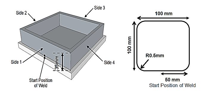 In order to obtain an insight into the effects of distortion, two sets of WAAM square samples (see Figure 1) were deposited using the integrated SAM Edgetek machine using the conditions in Table 1.