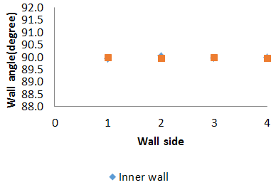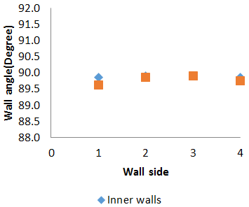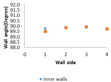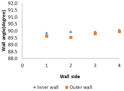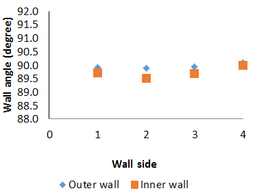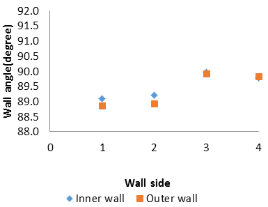 Figure 6 shows the result of the trials when the sample was not machined nor was its base plate removed. This is the deposited sample on the base plate (see Figure 3) and this is the level of perpendicularity of the deposited wall prior to removing the base plate and prior to machining. It can be seen from Figure 6 that the deposited walls were not actually perpendicular to the base plate, but the graph shows the actual perpendicularity of each of the four walls deposited which can be compared to when the base plate is removed or the surface of the wall machined.