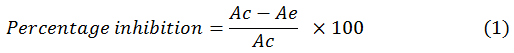 The radical scavenging potential of cooked rice extract was determined by the DPPH radical scavenging assay reported by Turkoglu, et al. [20]. Briefly, 0.004% DPPH solution was prepared. Cooked rice extract (0.1 mL) was mixed with DPPH reagent (p.3 mL) and kept in the dark for 30 min of the resulting mixture was taken at 516nm. The DPPH reagent without the sample extract was used as control.. The percentage inhibition of the extract was calculated using Equation 1.