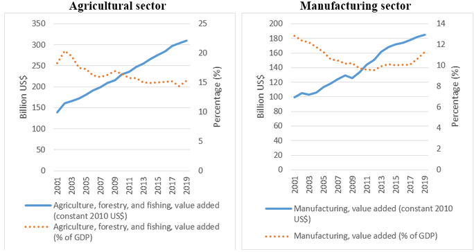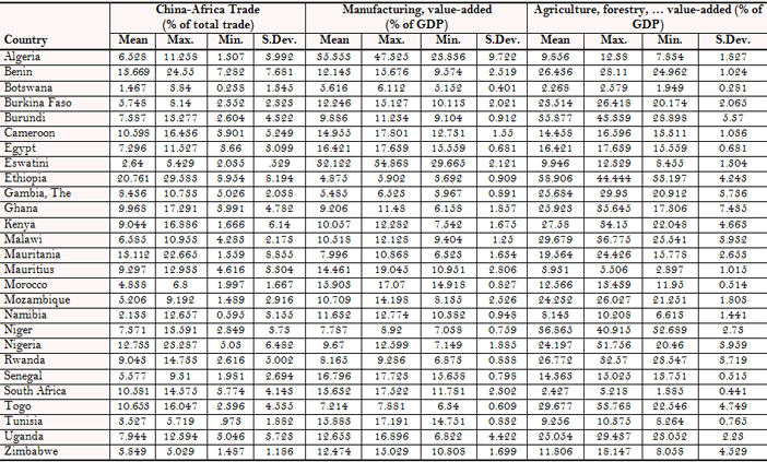 Thus, this study revisits the analysis of the implication of China-Africa trade for Africa’s non-mineral resources sectors. It contributes to the literature on China-Africa trade analysis in two distinct ways. First, it examines the effect of China-Africa trade on the non-mineral resources sectors’ performance. The performance of the non-mineral sectors of the economy is measured as the value added by the sectors relative to the total GDP (Apergis et al., 2014; Matallah, 2020) as against export-based indicators used by related studies such as He (2013) and Habiyaremye (2016). Our choice indicator appears more representative as a measure of sectoral performance, as export indicators [such as sectoral export (as in He (2013)) and export diversification index (as in Habiyaremye (2016)] do not capture improvement in the productive capacity within the absorptive level. This tends to underestimate the performance of the sector. Also, rather than focusing only on the manufacturing sector, analysis of the Dutch disease implication of the China-Africa trade was extended to Africa’s agricultural sector. The consideration of the agricultural sector was justified based on the study by Apergis et al. (2014) which found evidence of a Dutch disease effect of an oil sector boom on agriculture in the MENA countries.