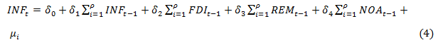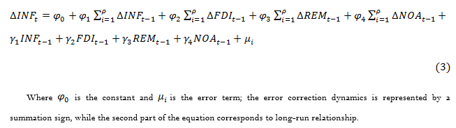 In this study, we employ the Autoregressive Distributed Lag (ARDL) cointegration method developed by Pesaran, Shin, and Smith (2000); Pesaran et al. (2001) with the inclusion of unrestricted vector error correction model to explore the long-run relationship between foreign direct investment, remittance inflows net official development assistance received and inflation. For the purpose of estimation, we developed an ARDL model as follow: