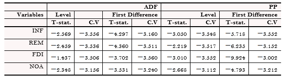 To determine the stationary properties, we employ the Augmented Dickey-Fuller (ADF)and Phillips-Perron (PP)unit root tests. We first carried out the unit root tests using level data and thereafter performed these tests based on first difference data.