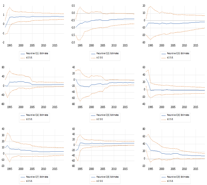 Table 3 ascertain the optimal lag length used to estimate the model, we employed the unrestricted vector autoregression (VAR) method to decide the best lag length. The decision criterion is based on minimum value of AIC of lag 2 as shown in Table 3.