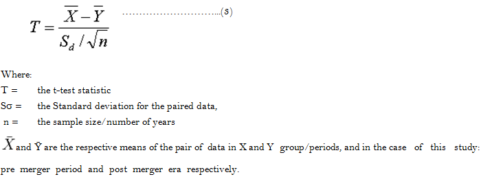 Under this second model, hypotheses were tested using paired student t-test for unequal variances. The relevant paired student t-test model for unequal variances used in this study is given as (3)