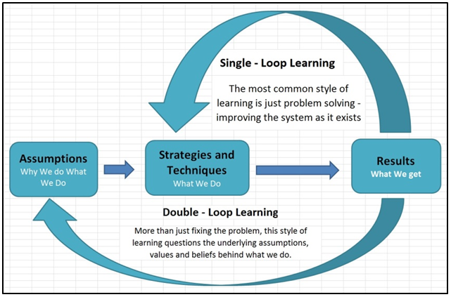In Figure 1 above, Rasulov (2017) highlights the sequence Chris Argyris followed in his study on organisational learning. This involved starting with the assumptions that the organisation knows why it does what it does. This is followed by the strategies and techniques which determine what the organisation is actually doing. Thereafter, the results are what is achieved from the strategies and techniques. Figure 1 shows how single-loop learning and double-loop learning relates to organisational learning. Single-loop learning is focused on solving the problems that arise or correcting the errors identified from the undesired results of the strategies implemented. On the other hand, double-loop learning is concerned with reviewing the entire chain of thought, from the assumptions, values or beliefs of the organisation to the strategies implemented in order to ensure the desired results. According to Zaleznik (1992) the efficient manager adopts impersonal attitudes towards goals, which themselves are deeply embedded in the organisation’s history and culture while leaders on the other hand are active instead of reactive, shaping ideas and adopting a personal attitude toward goals. Zaleznik (1992) further states that managers view work as an enabling process involving a combination of people and ideas interacting to establish strategies and make decisions, while leaders work from high-risk positions and are disposed to seek out risk when opportunity arises. Therefore, it can be said that within an organisation, managers may be inclined to using the single-loop learning approach as opposed to leaders who may be inclined to adopting the double-loop learning approach. According to Argyris (1973) organisations come into being when goals to be achieved are too complex for any one individual. Chris Argyris also mentions the drive behind why employees do what they do. He indicates that, “employees produce the energy for the organisation and they do that to seek individual gain”. This gain is linked to their needs (Argyris, 1973). From the Argyris theory, it can be said that an organisation can be improved through Single and Double Loop Learning.