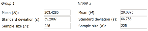 The standard deviation, effect sizes and confidence intervals were calculated. During the calculations, the data results were further grouped into two groups. The two groups were the group that supported the recommendations (group 1) and the group that had low job satisfaction levels (group 2). Mean values were calculated from the two groups and for group 1 it was found to be 203.4285714 with a median of 225 and a mode of 225 and for group 2 , the mean value was found to be 29.6875 with a median of 3.5 and a mode of 0. Although the standard deviation had minimal impact on this study, it was however calculated in order to indicate that the respondents did not all fall into the same category on the Likert-scale responses. The standard deviation for group 1 was found to be 59.2007 while for group 2 it was 66.756. The standard deviation formula used considered only the sample data used. Figure 5 below presents the data that was extrapolated from the mean value and standard deviation calculation to determine the effect sizes.