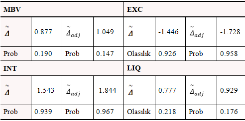 In the analysis, an evaluation is made to choose between fixed effect and random effect models. The tests used for this purpose are F test, Breuch-Pagan LM test and Honda test. The results are shown in Table 9. According to F test results, group and time two way fixed effects model is suggested. However LM and Honda Tests suggest two way random effects model. Considering data set of the study, two way random effects model is chosen for the analysis.